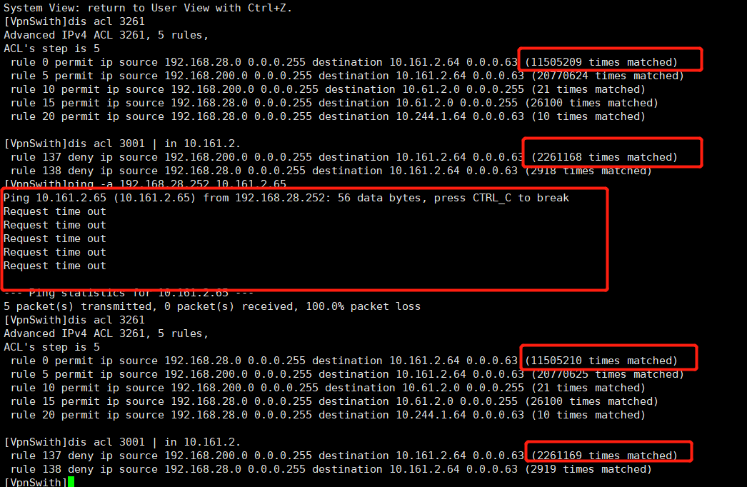 ping -a 10.161.2.65 192.168.28.252测试的时候,acl 前后反应