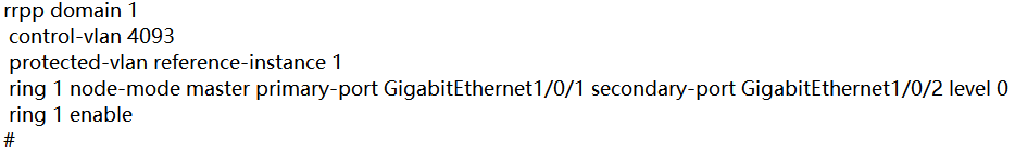 [DeviceA-rrpp-domain1] ring 1 node-mode master primary-port gigabitethernet 1/0/1 secondary-port gigabitethernet 1/0/2 level 0