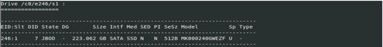 在Linux操作系统下安装storcli工具后,在命令行输入./Storcli 64/c0 show all,可以查看控制器下所有的硬盘信息,选择想要查看的硬盘,例如下图中,EID为246,slt为1的硬盘。