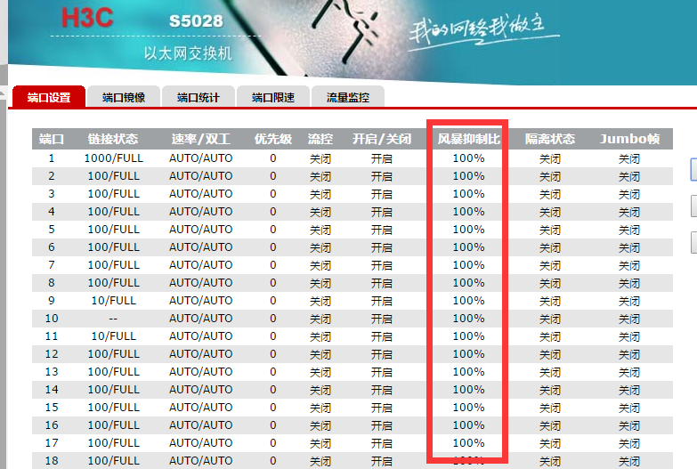 风暴抑制比: 您可以在端口下设置其允许通过的最大广播/组播/未知单播报文流量。当端口上的广播/组播/未知单播流量超出您设置的值后,S5028将丢弃超出广播/组播/未知单播流量限制的报文,从而使端口广播/组播/未知单播流量所占的比例降低到限定的范围,保证网络业务的正常运行 缺省情况下为100%,表示不抑制