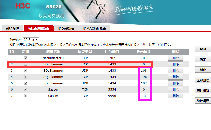 开启防蠕虫病毒攻击功能后,S5028直接丢弃符合病毒特征信息的报文,从而保护正常计算机及网络设备。S5028缺省为用户定义了7种蠕虫病毒的特征信息,您也可以根据自己的需要定义新的蠕虫病毒。