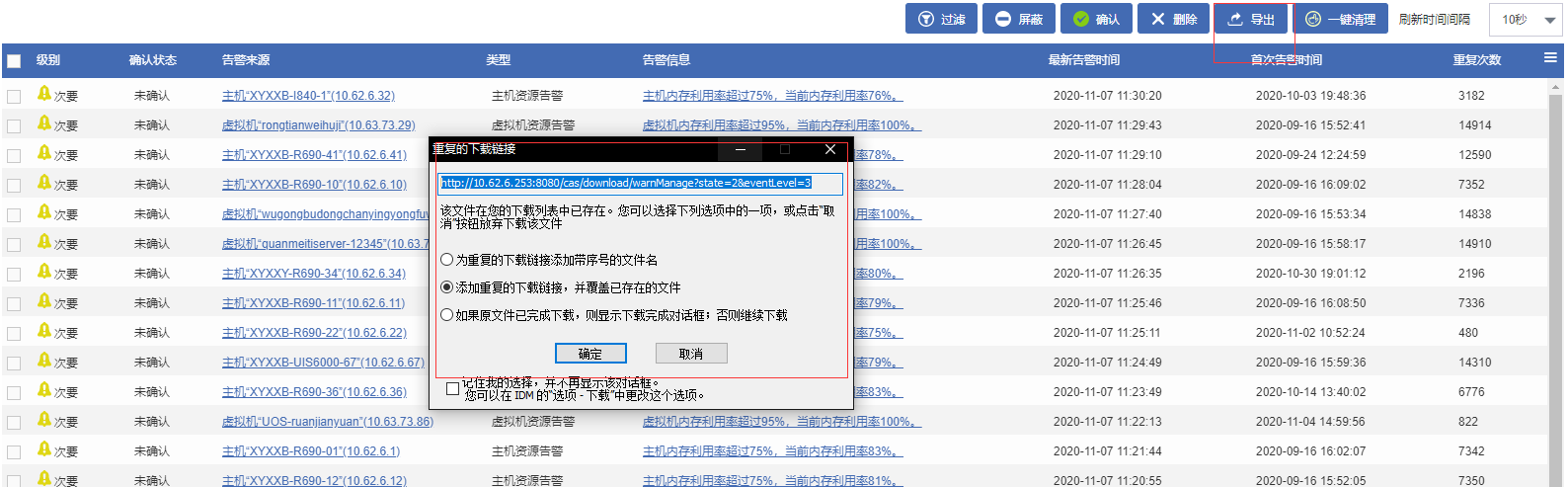 这个还是无法导出,因为是每间隔10s刷新一次告警,所以之前没有截图到,选定后还是无法顺利导出