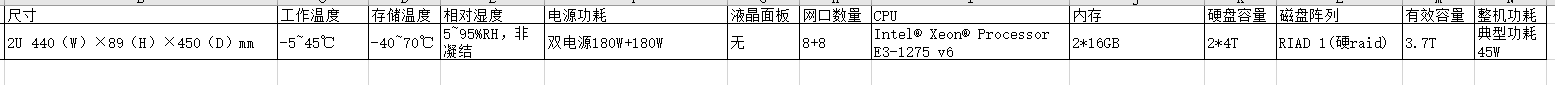 尺寸 、 工作温度、存储温度、相对湿度、电源功率、网口数量、CPU、内存、硬盘容量、磁盘阵列、有效容量、整机功耗