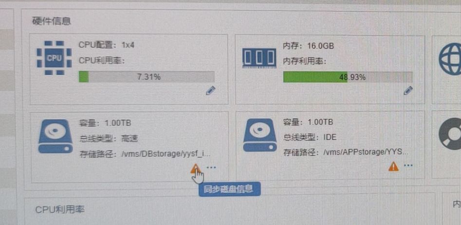 如图 有台虚拟机使用共享存储 虚拟磁盘提示同步磁盘信息告警 其他调用该共享存储的虚拟机无此告警 而且点击同步磁盘信息完成后问题复现