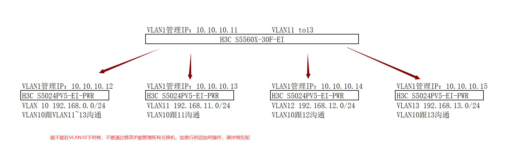 如果vlan10-13的网关都在最上面的交换机的话,所有交换机连接建议设置成trunk模式,允许对应的vlan通过,配置vlan1 的管理IP,配置缺省路由下一跳指向最上面的交换机,然后在最上面的交换机做ACL访问控制