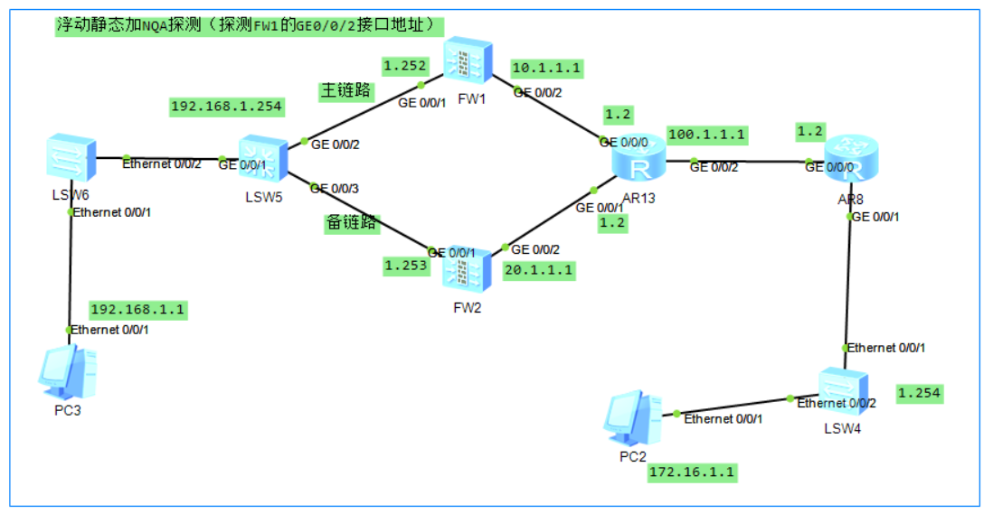 现场组网比较简单,防火墙做不了堆叠的情况下且是下层网络的出口,核心堆叠后采用浮动静态路由加NQA探测FW1的GE0/0/2接口地址的方式来实现链路主备,请问一下这种的话需要加心跳线来实现会话备份之类的吗