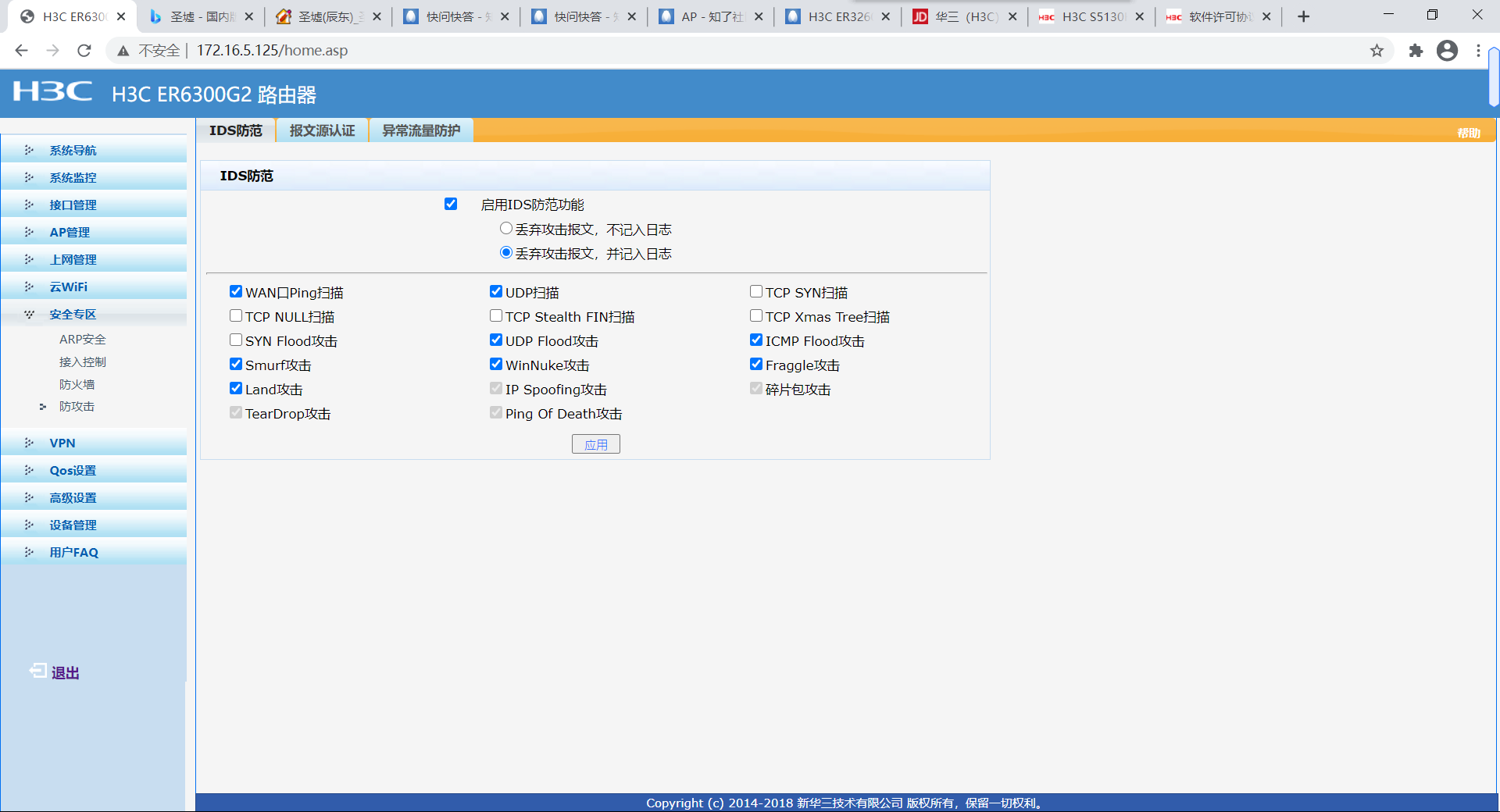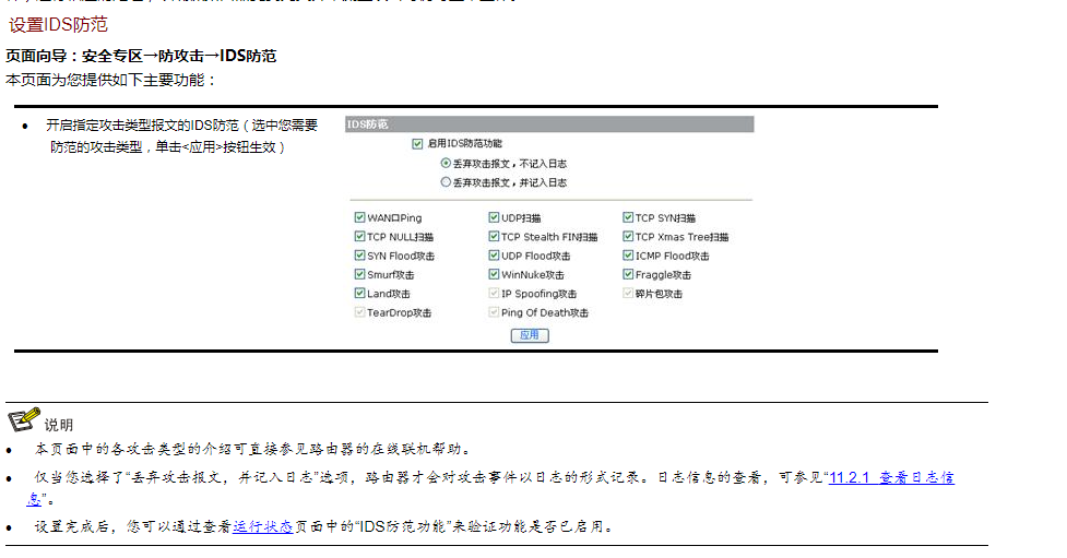 ·     开启指定攻击类型报文的IDS防范(选中您需要防范的攻击类型,单击<应用>按钮生效)