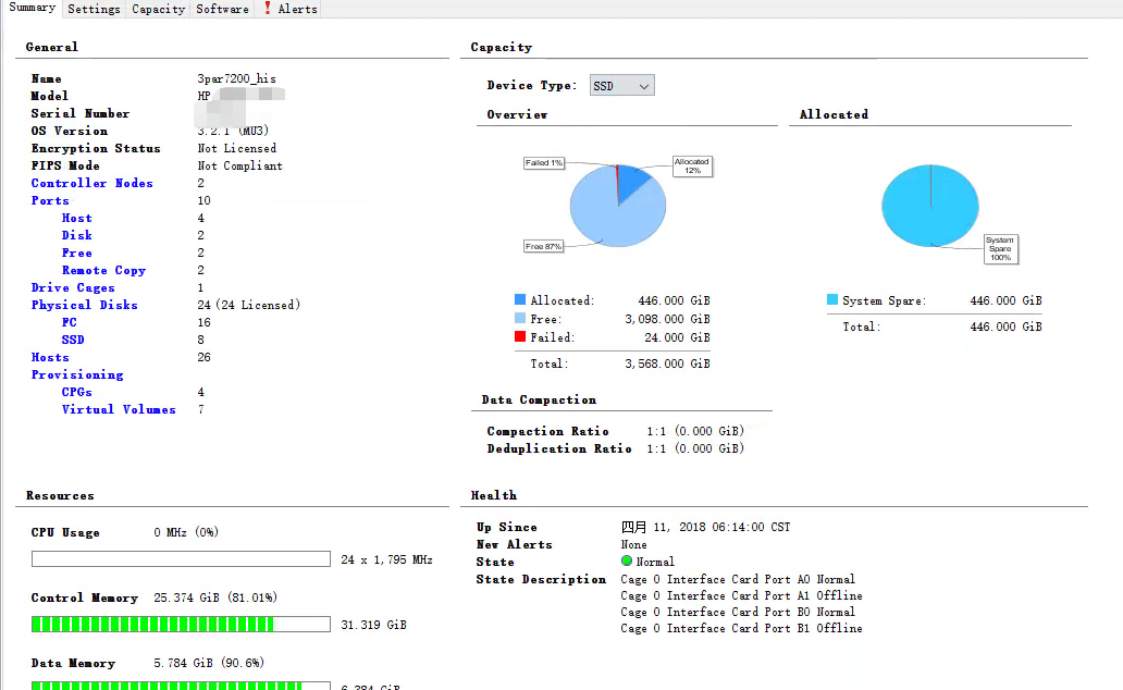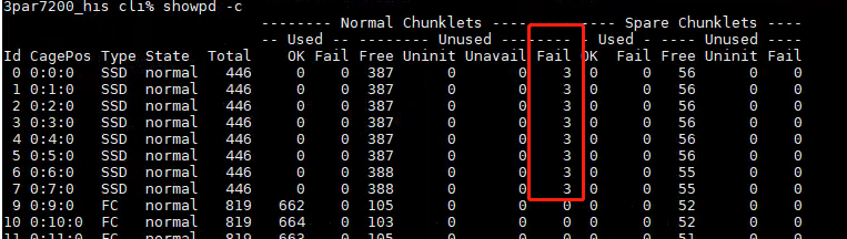 cli% showpd -e -Read Error- -Write Error- Id CagePos Type State Corr UnCorr Corr UnCorr T(C) LifeLeft% 0 0:0:0 SSD normal 0 0 0 0 26 92 1 0:1:0 SSD normal 0 0 0 0 28 93 2 0:2:0 SSD normal 0 0 0 0 28 92 3 0:3:0 SSD normal 0 0 0 0 28 92 4 0:4:0 SSD normal 0 0 0 0 28 92 5 0:5:0 SSD normal 0 0 0 0 29 92 6 0:6:0 SSD normal 0 0 0 0 28 92 差不多都是这样