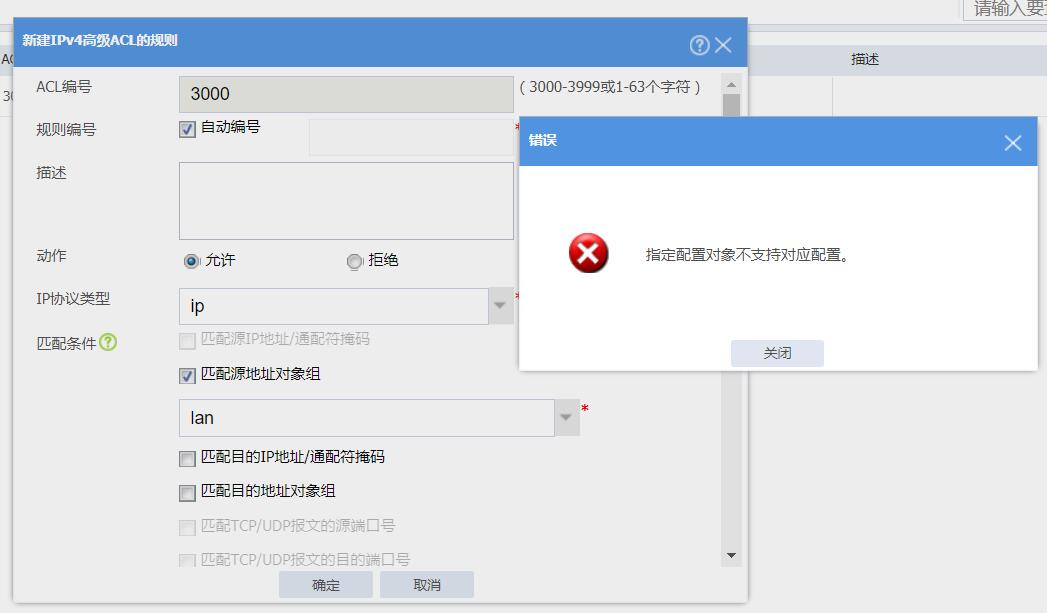 防火墙ACL配置中添加提示“指定配置对象不支持对应配置”Lan地址段为:172.17.1.0/24,请问该处如何配置,谢谢。