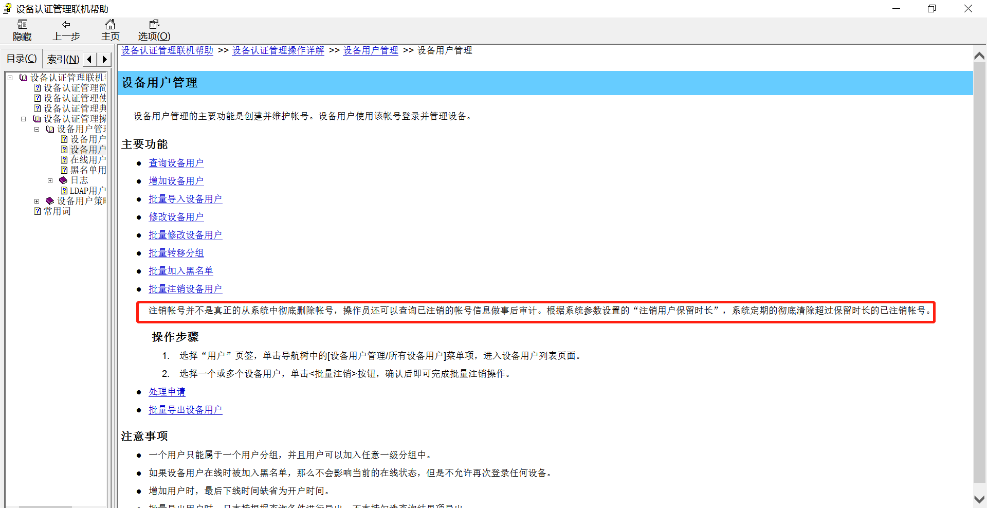 注销帐号并不是真正的从系统中彻底删除帐号,操作员还可以查询已注销的帐号信息做事后审计。根据系统参数设置的“注销用户保留时长”,系统定期的彻底清除超过保留时长的已注销帐号。(图为IMC -TAM设备认证联机帮助)目前,TAM相关功能已经迁移到IMC-EIA,请参考