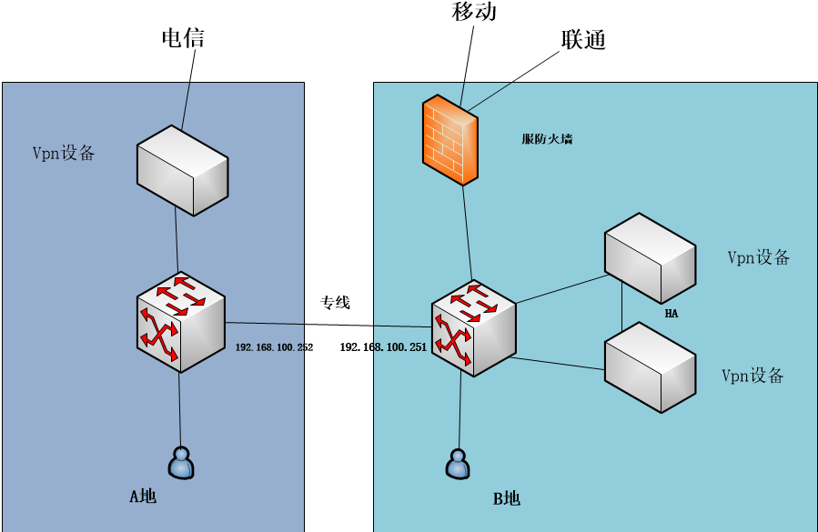 现实现A、B两地专线和vpn自动切换 A地:10.11.0.0/16 B地:10.24.0.0/16
