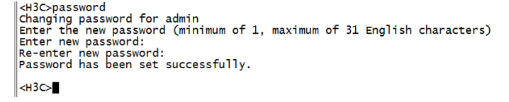 使用Consosle口登陆设备,参考【01设备管理】章节中的【1.1.1 Console方式登录设备方法】<H3C>提示进入设备命令行,输入password命令并回车,按照系统提示,提示:enter new password(输入新密码),则可以直接输入新密码,并重新输入一次确认即可。