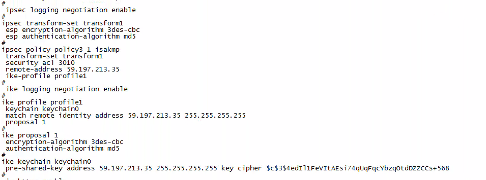 3、检查ike keychain/ike profile 协商参数配置是否正确(工作模式、keychain、identity、本端/对端隧道地址或隧道名称、NAT穿越功能v7自适应)
