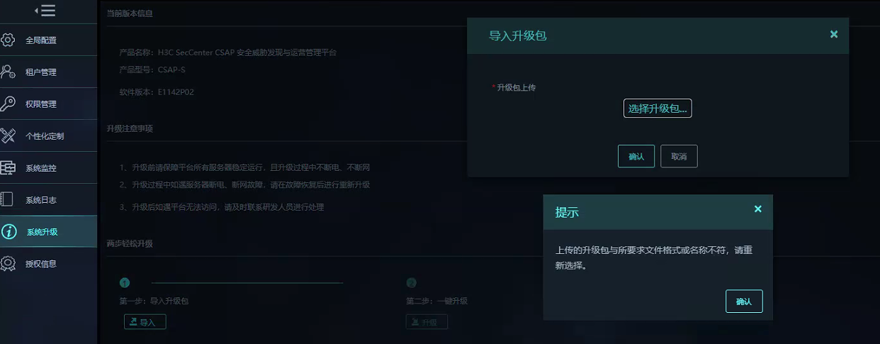 (1) 登录安全威胁发现与运营管理平台,进入系统配置-系统升级页面。