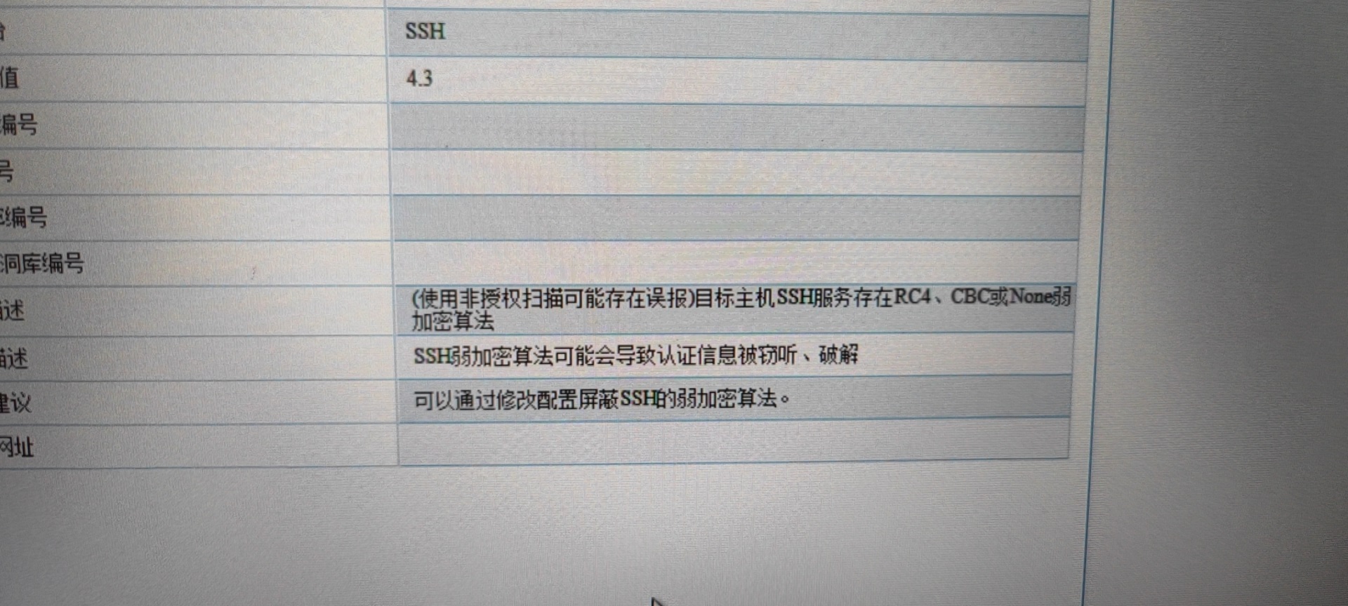 如题,如图,IDS漏洞扫描的结果,请问需要修改什么配置以屏蔽SSH的弱加密算法。