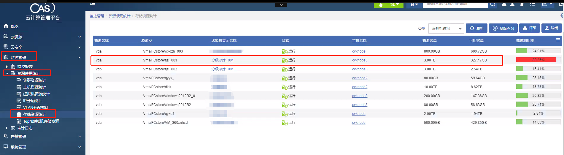 虚拟机 硬盘空间已经做了扩容 和 数据删除,该如何消除CAS 云管平台里面的 监控管理里 存储资源统计89%的 红色告警,已经做了虚拟机重启和 service cas__mon restart  动作