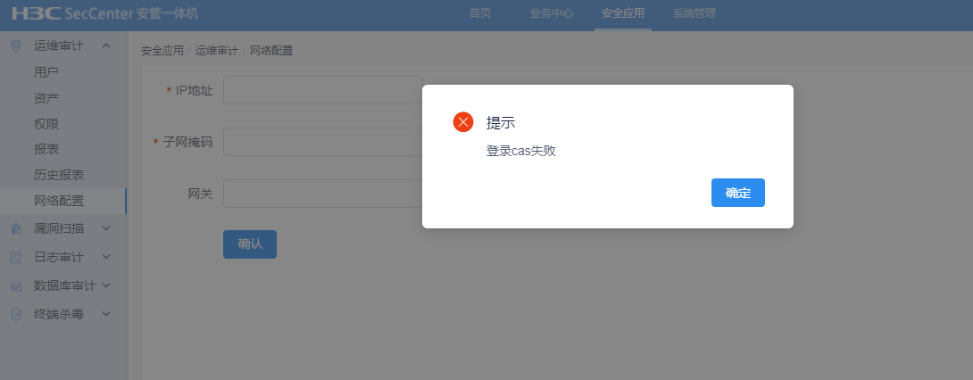 安管一体机登录应用系统时老提示“登录CAS失败”,在如图的网络配置中添加完IP地址也一样提示。但CAS系统单独是可以登录 上去的,