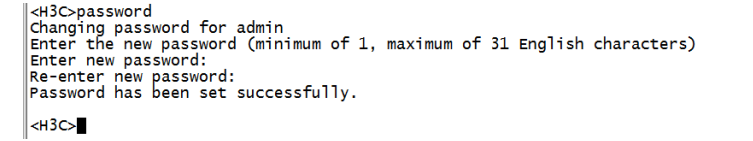 使用Consosle口登陆设备,参考【01设备管理】章节中的【1.1.1 Console方式登录设备方法】<H3C>提示进入设备命令行,输入password命令并回车,按照系统提示,提示:enter new password(输入新密码),则可以直接输入新密码,并重新输入一次确认即可。