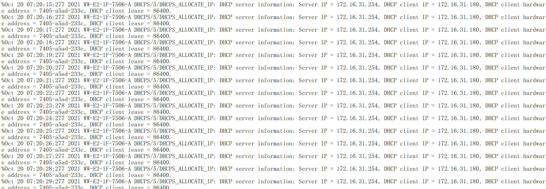 一般不会一分钟一次发一个这个日志,你这个很有规律,我怀疑是客户端有规律性的掉线,引起的重新分地址,你看下客户端有没有频繁的掉线,或者链路有没有频繁的抖动