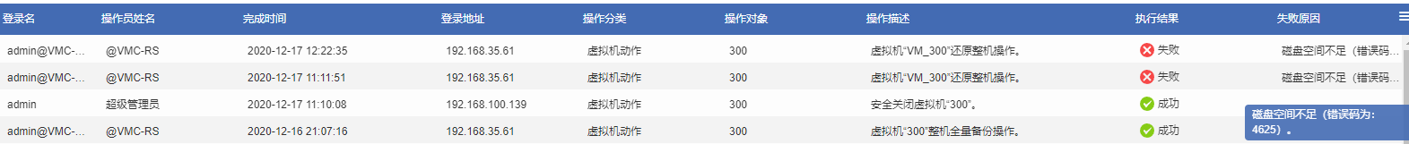 您好,错误码是啥?如果是4625,那么需要确认虚拟机本身磁盘多大?共享存储剩余空间多大?报错指的就是磁盘空间不足。