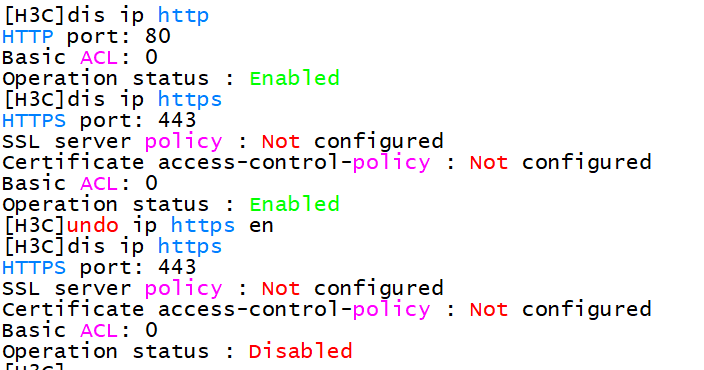[H3C]dis ip http HTTP port: 80 Basic ACL: 0 Operation status : Enabled [H3C]dis ip https HTTPS port: 443 SSL server policy : Not configured Certificate access-control-policy : Not configured Basic ACL: 0 Operation status : Enabled