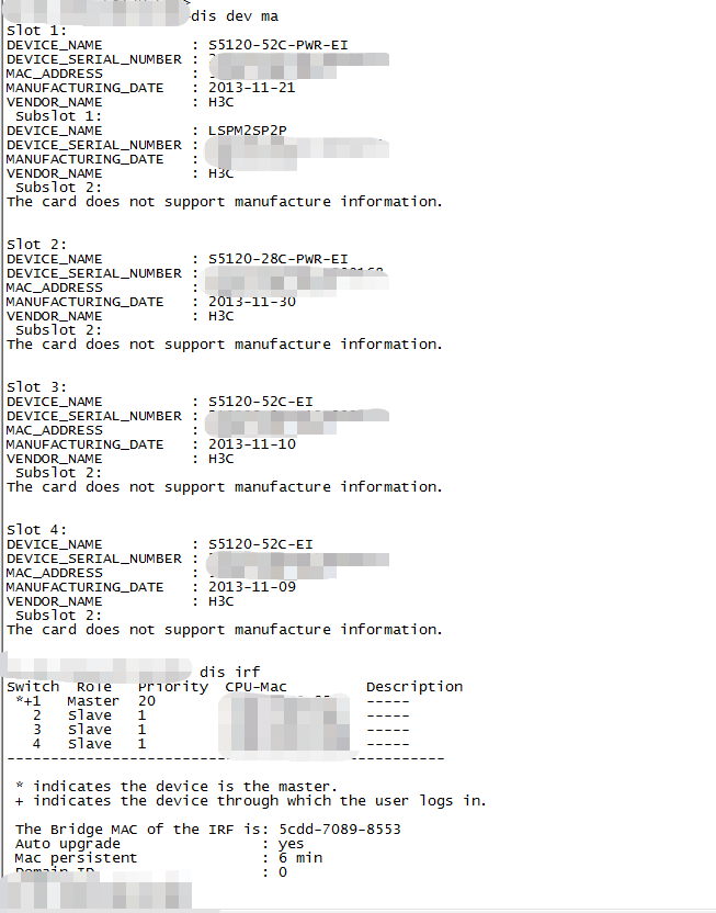 Slot 1: DEVICE_NAME : S5120-52C-PWR-EI DEVICE_SERIAL_NUMBER : 210235A0JTH13B000103 MAC_ADDRESS : 5CDD-7089-9093 MANUFACTURING_DATE : 2013-11-21 VENDOR_NAME : H3C Subslot 1: DEVICE_NAME : LSPM2SP2P DEVICE_SERIAL_NUMBER : 210231A98LC13B000233 MANUFACTURING_DATE : 2013-11-18 VENDOR_NAME : H3C Subslot 2: The card does not support manufacture information. Slot 2: DEVICE_NAME : S5120-52C-EI DEVICE_SERIAL_NUMBER : 210235A0BMH13B000237 MAC_ADDRESS : 5CDD-7014-558C MANUFACTURING_DATE : 2013-11-09 VENDOR_NAME : H3C Subslot 2: The card does not support manufacture information. Slot 3: DEVICE_NAME : S5120-52C-EI DEVICE_SERIAL_NUMBER : 210235A0BMH13B000422 MAC_ADDRESS : 5CDD-7014-83CC MANUFACTURING_DATE : 2013-11-11 VENDOR_NAME : H3C Subslot 2: The card does not support manufacture information. Slot 4: DEVICE_NAME : S5120-52C-EI DEVICE_SERIAL_NUMBER : 210235A0BMH13B000281 MAC_ADDRESS : 5CDD-7014-608C MANUFACTURING_DATE : 2013-11-09 VENDOR_NAME : H3C Subslot 2: The card does not support manufacture information. 这个IRF成员里面有三种型号的设备,人都麻了