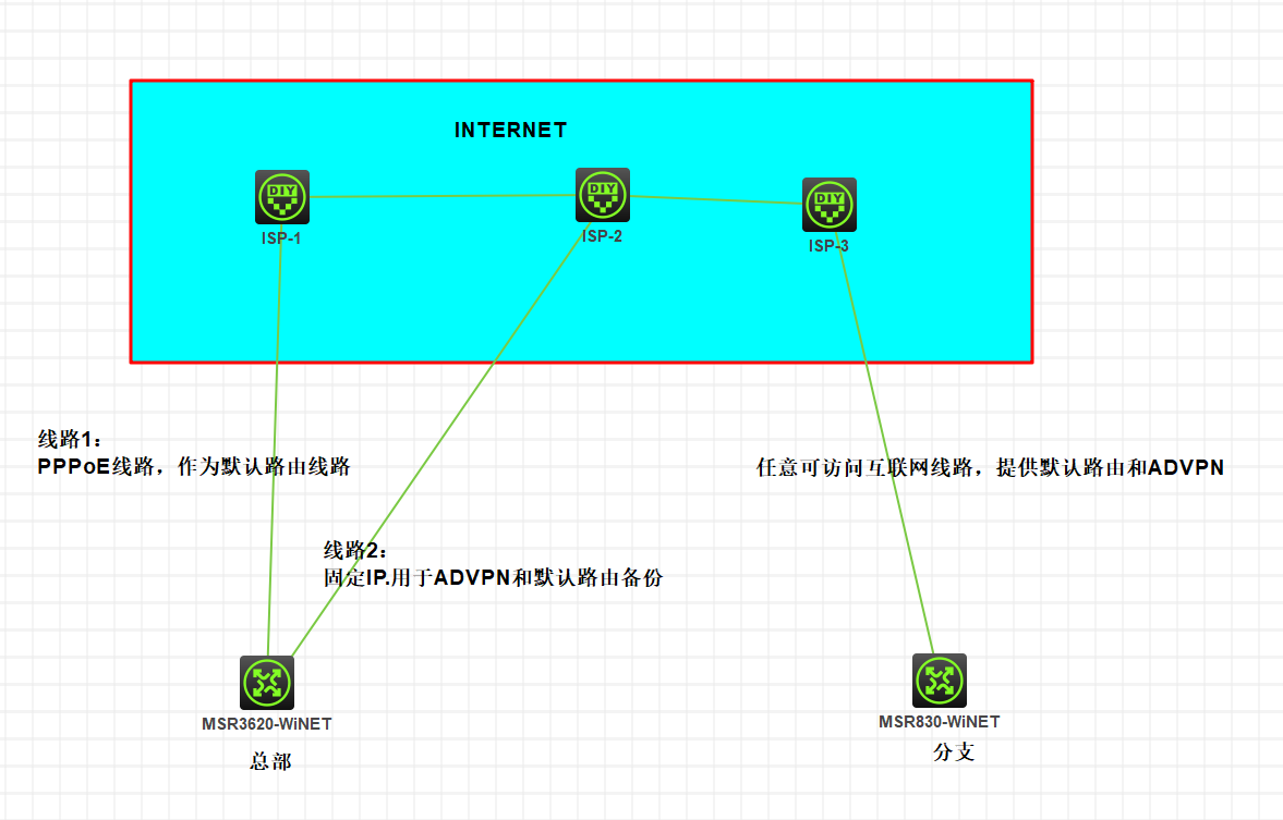 我的总部和分支使用winet系列路由器通过云简进行ADVPN组网。最开始总部只有一个固定IP线路,分支与总部的ADVPN没问题。现在总部新增了一条PPPoE线路用于互联网访问,固定IP用来连接VPN和做出口备份(拓扑见下图),当我把总部的默认路由切换拨号线路后,分支和总部的ADVPN、终端和总部的L2TP就会断开连接造成分支无法访问内网。请问如何实现拨号线路做默认路由且VPN正常使用。