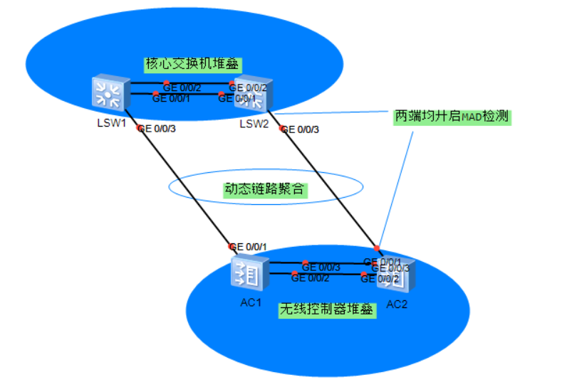 无线控制器和核心交换机均做IRF,采用LACP的MAC检测机制,在核心与无线控制器两端聚合口下都配置mad enable,没有单独搭建其他链路来做检测,请问这种使用数据链路做MAD检测是否有问题呢?大致拓扑如下: