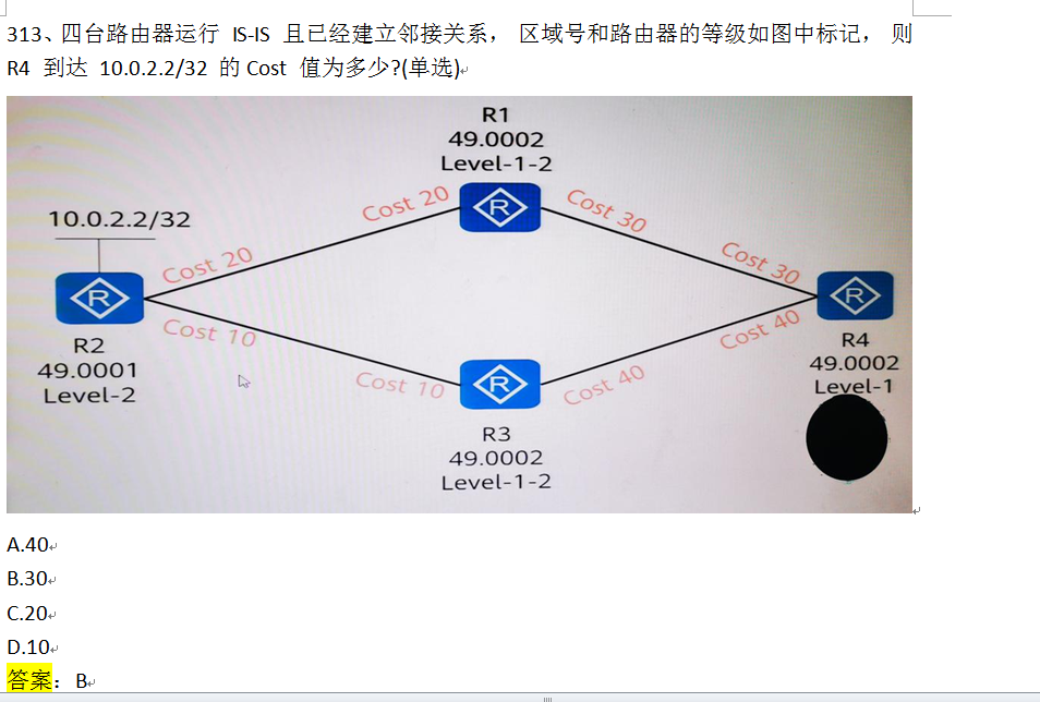 (R4)做为L1路由器选择最近(COST 30)的一个L1/L2路由器(R1)作为出本区域的所有流量的出口;