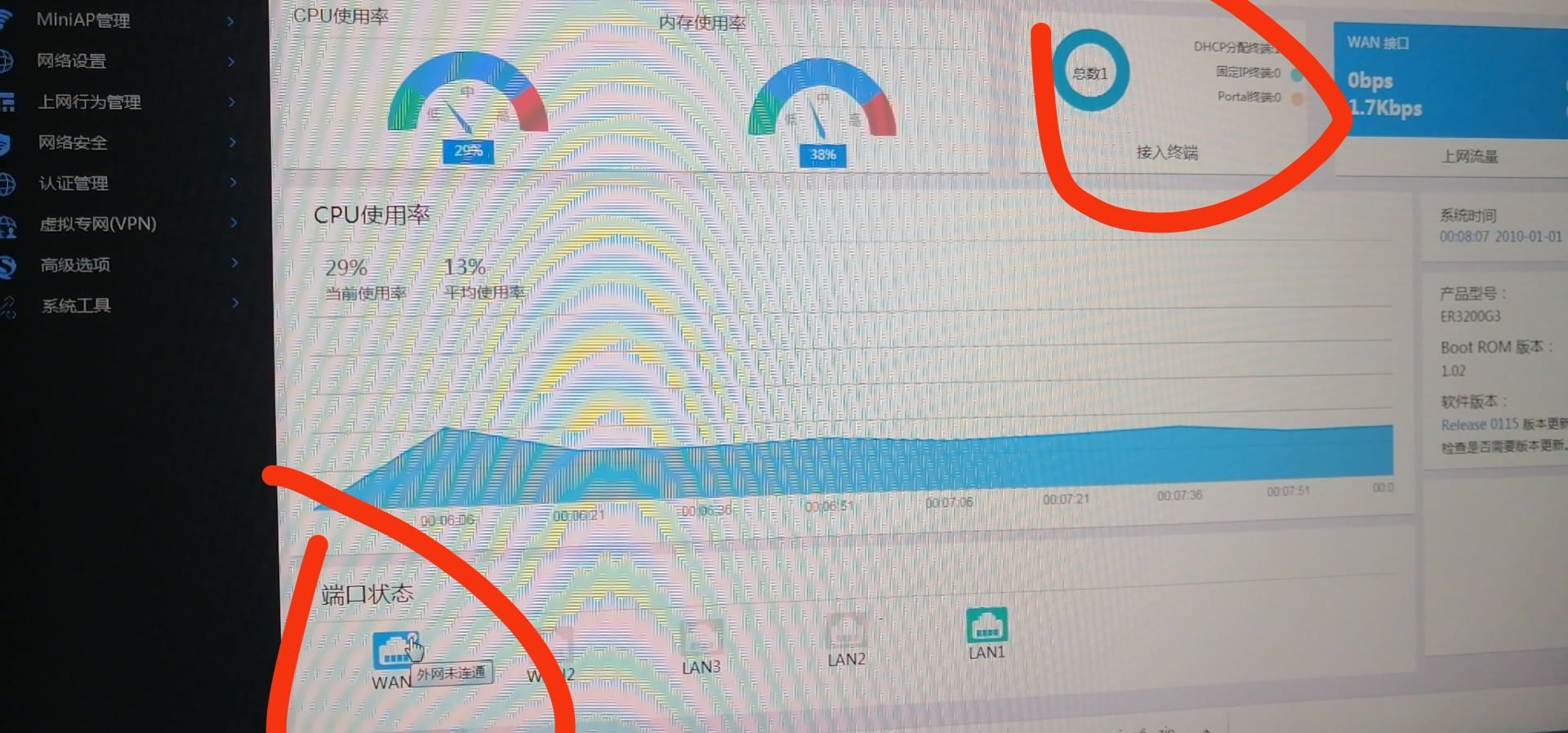 路由器出厂设置,光猫已经成功拨号连网,路由W口连光猫千兆口,路由L口连电脑但不能上网