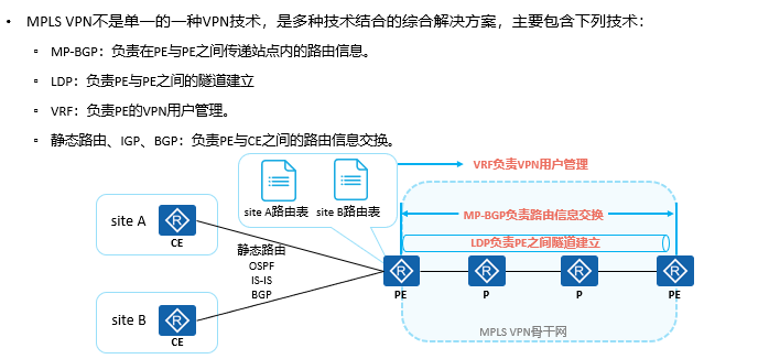 关于MPLS VPN 搭建:如图所示,多种技术的结合到底怎么理解, mpls域内本来配了OSPF已经可以全网可达,为什么还有LDP建隧道,既然已经建立隧道说明 PE之间可以跑隧道内了,为什么还要MP-BGP来传递?我做完实验了,但是一直想不明白原因