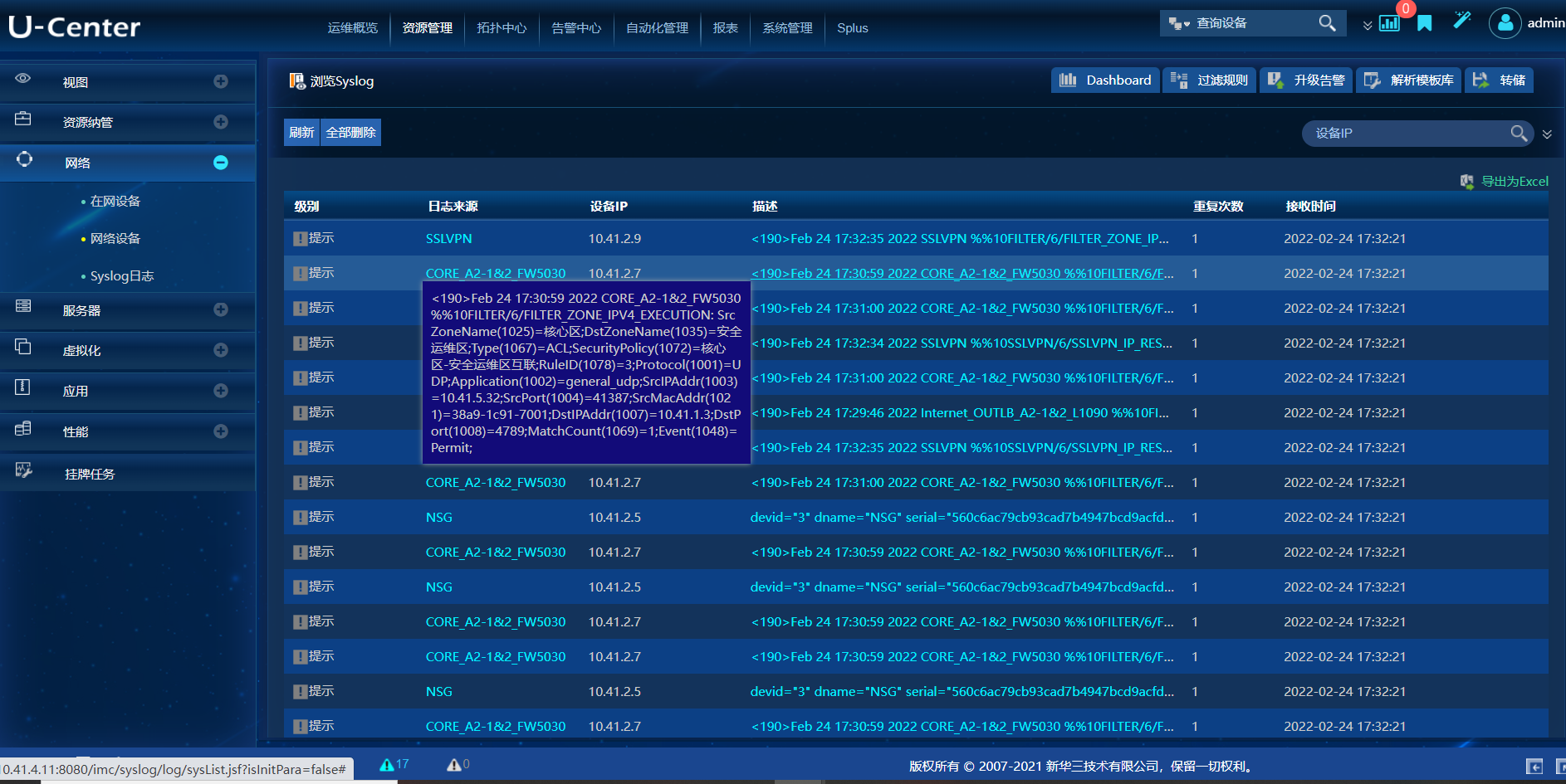 在U-Center中查看防火墙发送过来的Syslog日志,显示的是一串代码,导出Excel表格查看也是一串代码,请问如何才能像在防火墙一样有可视化列表查看日志呢?