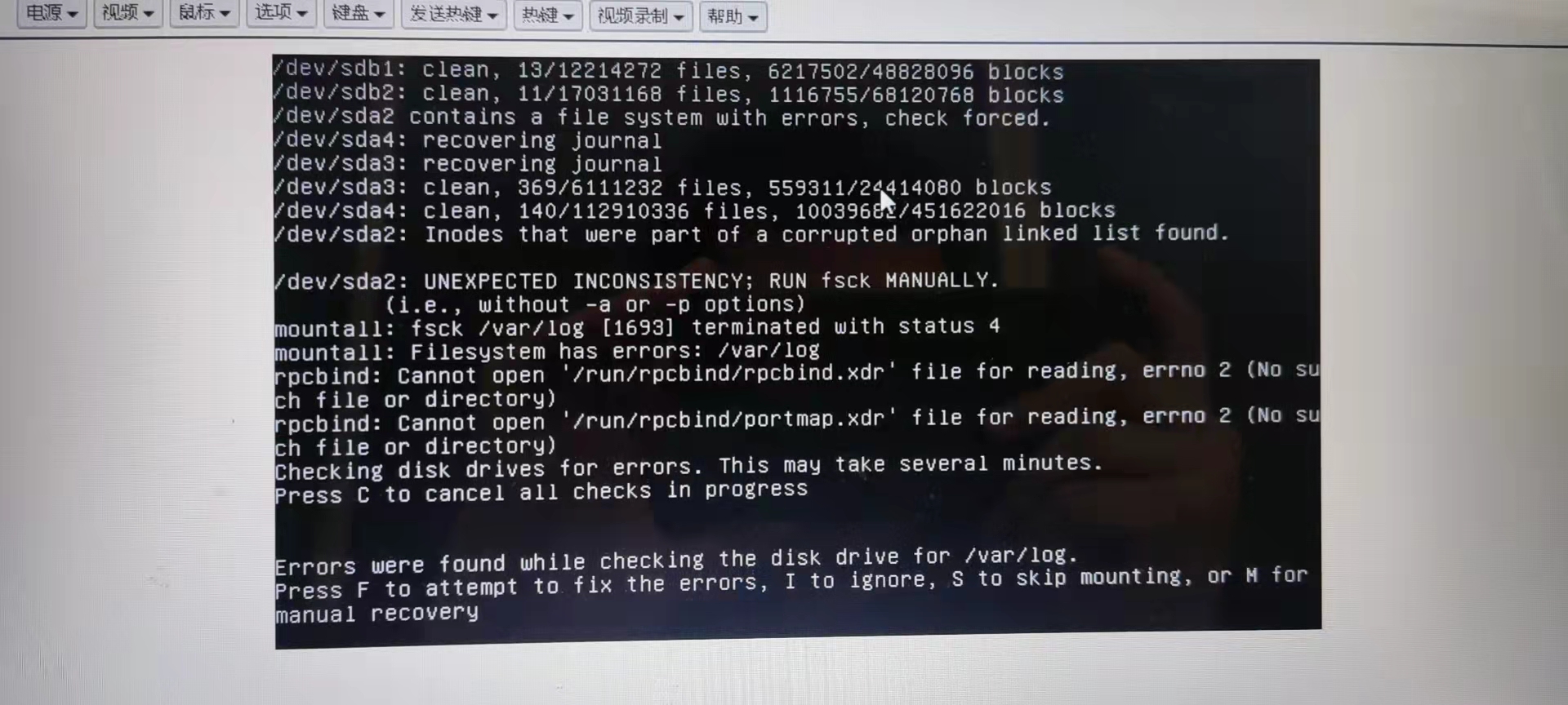按F就行了,然后就是等,这是Ubuntu的通病,异常断电回导致这个问题