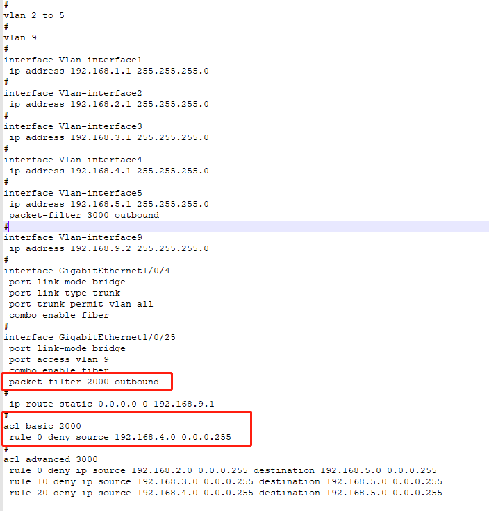 配置后,还是可以ping 192.168.9.1 已重启过三层核心交换机,把命令改成inbound也试过