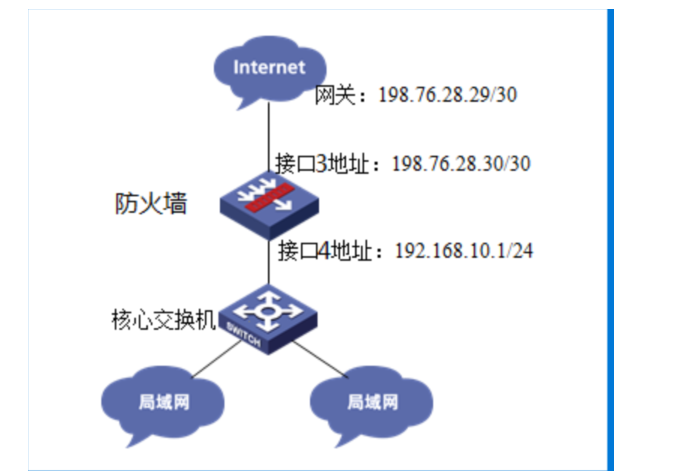 将防火墙部署在互联网出口,使用固定IP地址线路接入互联网。运营商提供的IP地址为198.76.28.30/30,网关为198.76.28.29,DNS地址为114.114.114.114。初步规划防火墙使用3接口接入运营商,使用4接口连接内部网络,内部网络使用192.168.10.0网段,要求内网终端可以自动获取到地址并可以访问互联网。
