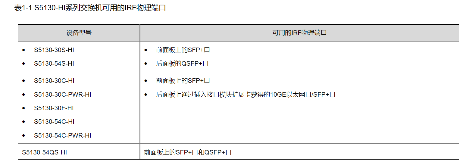 在S5130-HI系列交换机上可用的IRF物理端口如表1-1所示。并请注意“1.3 2. IRF物理端口配置注意事项”。