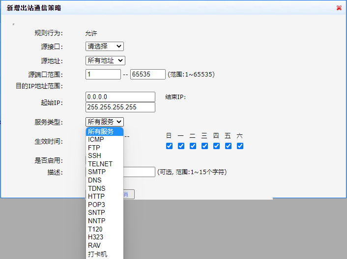 需求部分IP端口不做限制,可以上外网。部分IP只开通POP3 SMTP 远程桌面和特定的几个端口,其它端口都封闭保证安全。以前的G2可以在安全专区-防火墙-服务类型里面添加自定义的端口,然后在出站通信策略里面调用自带和自定义的端口。