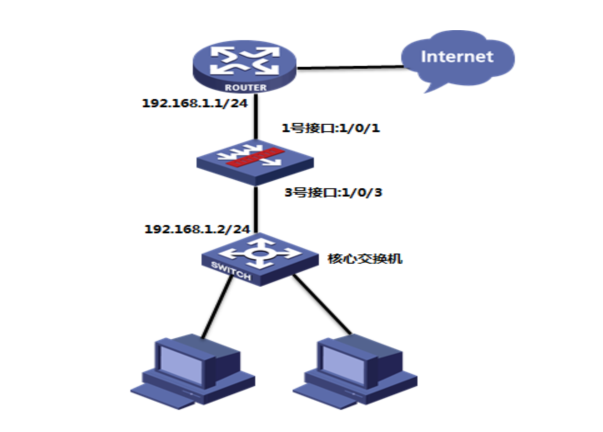 如下组网图所示,在原有的网络中增加防火墙来提高网络安全性,但又不想对原有网络配置进行改动,所以需要防火墙采用透明模式部署;其中GigabitEthernet 1/0/1接口接原有路由器的下联口,GigabitEthernet 1/0/3接口接原有的交换机上联口。