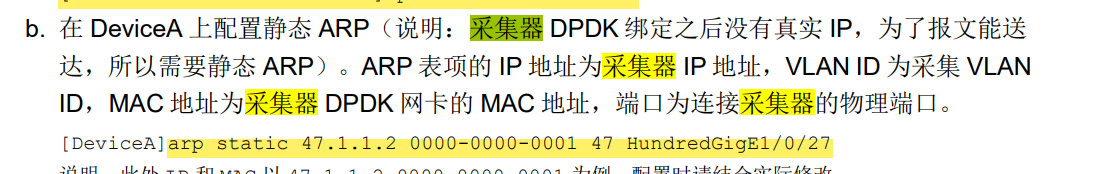 配置静态arp的原因是再分析器上配置完采集任务的时候,由于dpdk网卡的限制,分析器采集网卡会消失,所以交换机去往采集器采集网卡的路由也会消失,所以需要在互联设备上手动写一条静态arp指向采集器采集网卡。mac就是采集器采集网卡的mac,在安装采集器的时候请提前记录