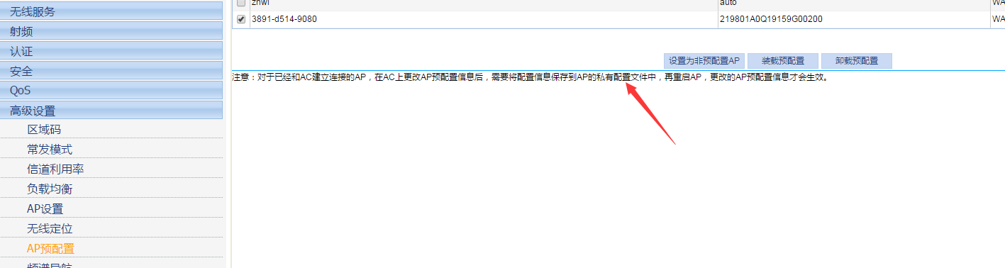 | 注意:对于已经和AC建立连接的AP,在AC上更改AP预配置信息后,需要将配置信息保存到AP的私有配置文件中,再重启AP,更改的AP预配置信息才会生效。 私有配置文件在哪里? |
