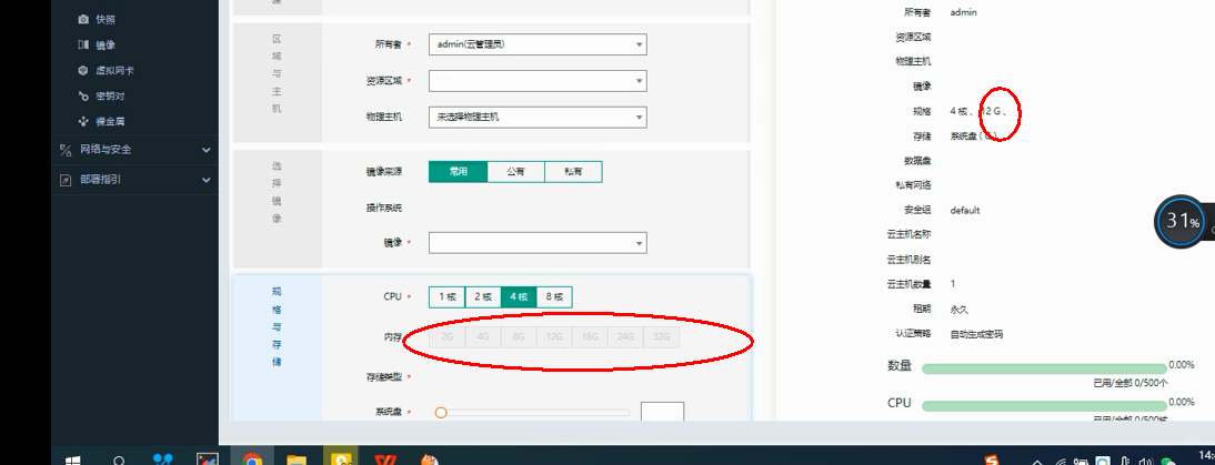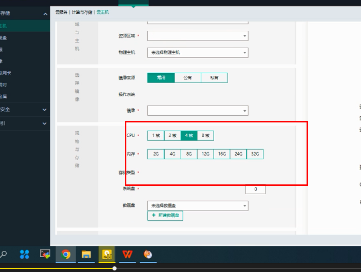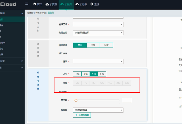 在使用UIS CLoudOS操作创建云主机,总是卡在“规格未配置”,进行操作分析,只要点击CPU的核数,就不能选内存。