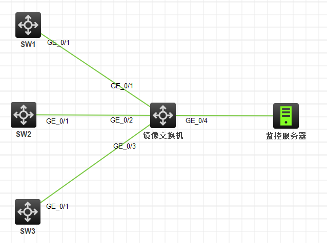 如图:SW1、SW2、SW3 分别代表三个网络,现要求通过镜像交换机把三个网络的指定流量镜像到监控服务器