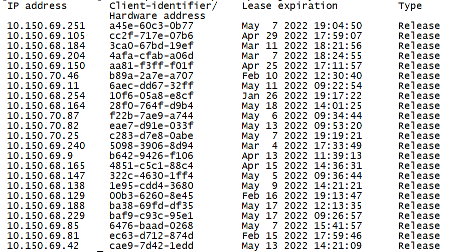在S5500交换机上做了DHCP下发服务,expired设置为0天4小时,但是发现大部分地址过期好久之后都没有回收。麻烦各位帮忙看看是怎么回事。