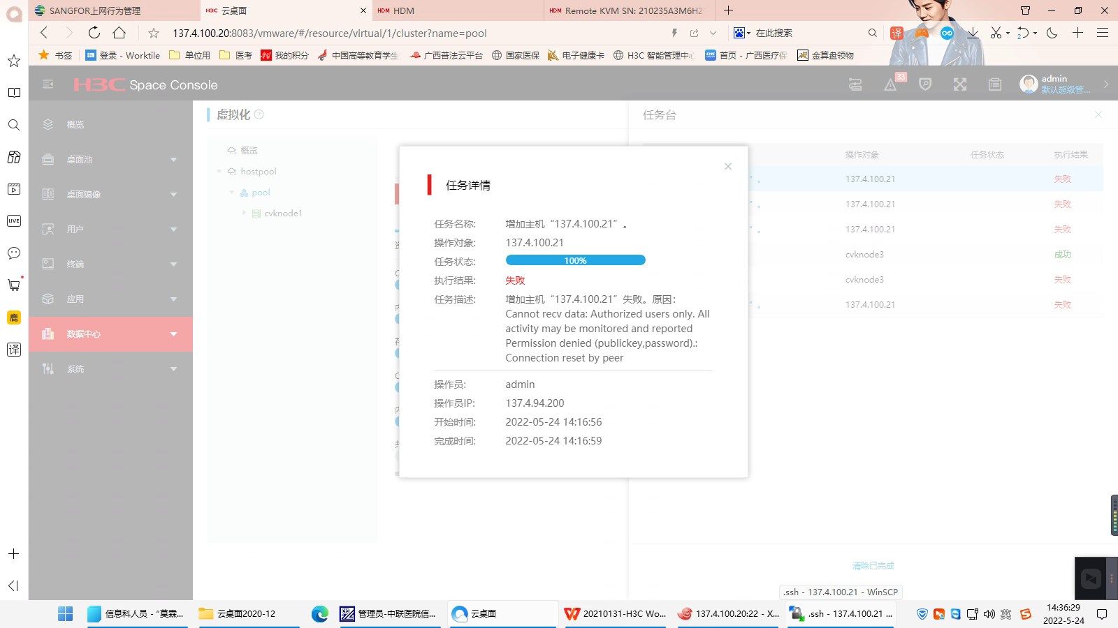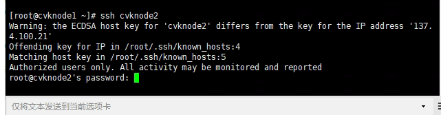 客户侧今天发现问题,部分用户无法连接桌面,查看平台后发现是主机3异常,连接失败,但网络正常,发现从cvknode1连接到cvknode3时提示输入密码,并提示免密失效,经过ssh-keygen -t rsa更新密钥后还是无效,于是在cvknode3上脱离cvknode1纳管,重命名为cnknode2,并在cvknode1上重新添加cvknode2,以此来解决问题,但现在添加cvknode2时,提示>Cannot recv data: Authorized users only. All activity may be monitored and reported Permission denied (publickey,password).: Connection reset by peer,在cvknode1下ssh cvknode2时,提示Warning: the ECDSA host key for 'cvknode1' differs from the key for the IP address '137.4.100.20' Offending key for IP in /root/.ssh/known_hosts:1 Matching host key in /root/.ssh/known_hosts:3 Authorized users only. All activity may be monitored and reported,主要还是免密失效的问题,这个问题要如何解决呢?