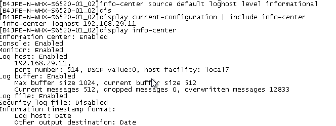 交换机配置日志审计,日志审计接收不到日志,info-center source default loghost level information这条命令好像没敲进去,时间同步,iP正确,路由可达,求大佬帮忙看看。