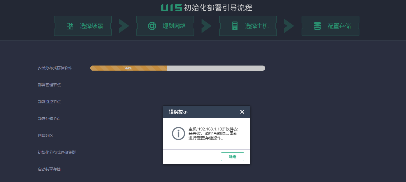 这个报错基本与节点网络配置异常有关,192.168.1.102这个节点检查下网卡配置和网关配置是否符合要求,或者重启102节点再重新部署试一下