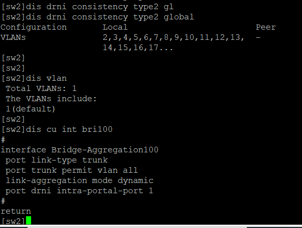 两个交换机直连做DRNI实验,提示type2全局配置不一致,IPP接口都是trunk vlan all,设备都只有一个默认VLAN1,sw2提示得有2,3,4.....是什么意思?
