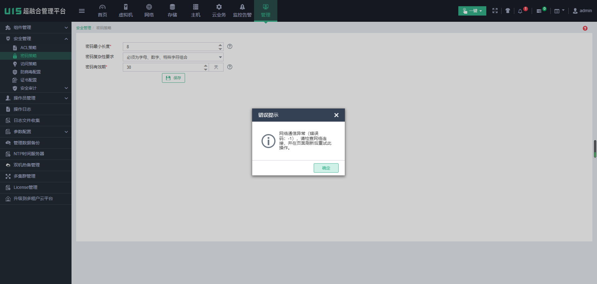 UIS超融合系统在设置密码有效期为30天的时候,出现网络通信异常(错误码:-1),请检查网络连接,并在页面刷新后重试此操作。