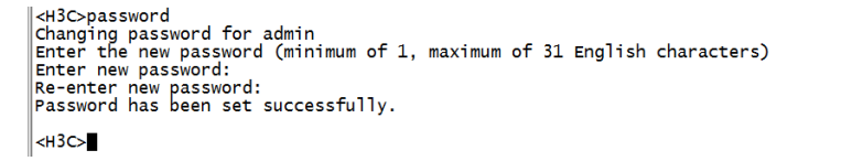 使用Consosle口登陆设备,参考【01设备管理】章节中的【1.1.1 Console方式登录设备方法】<H3C>提示进入设备命令行,输入password命令并回车,按照系统提示,提示:enter new password(输入新密码),则可以直接输入新密码,并重新输入一次确认即可。