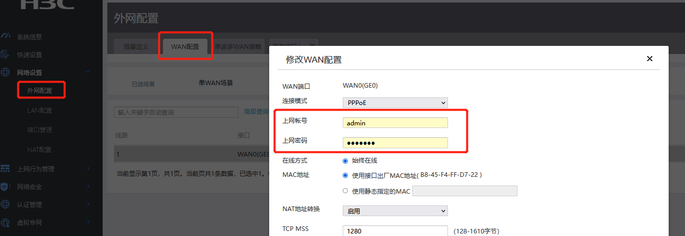 [H3C-GigabitEthernet0/0] pppoe-client dial-bundle-number 1 //将0口与拨号口进行绑定